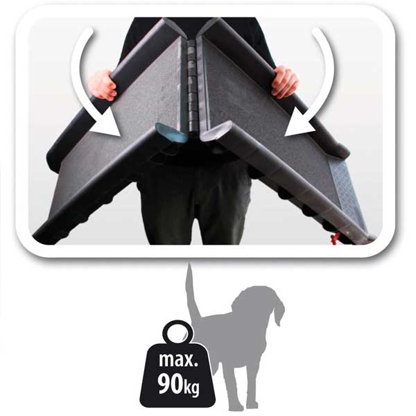 The ramp is made of plastic and features a non-slip surface. Its lightweight design and space-saving folding mechanism make the Gentle Step the perfect everyday companion. The ramp can support a maximum weight of 90 kg.