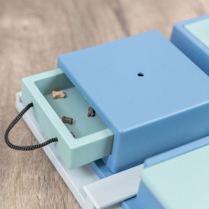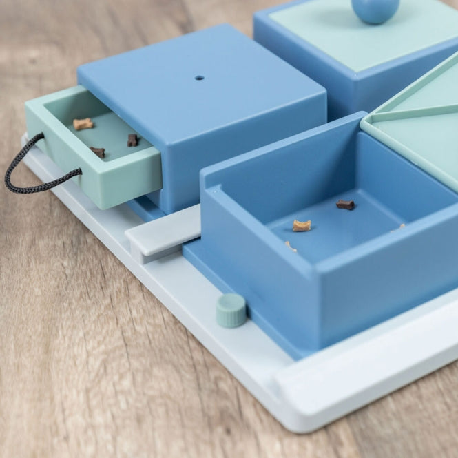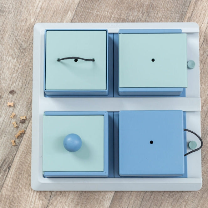 The Poker Box 1 is a unique toy that combines fun and strategy. The game box features four compartments that can be opened in different ways. Treats are hidden inside these compartments, which your dog will try to find. With a little practice, your dog will learn to open the compartments and get to the treats.