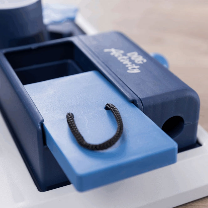 The Poker Box 2 is a special toy that combines fun and strategy. The game box has four compartments that can be opened in different ways. Treats are hidden inside, which your dog tries to find. With a little practice, your dog will learn to open the compartments using the loops or the lever, or to use the kicker or pedal to get to the treat.